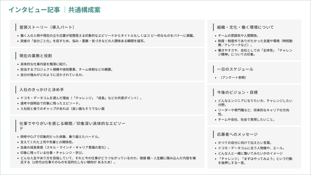 そこで、社内の多様な人材──若手・ベテラン・女性管理職など──へのインタビューや座談会を企画。社員の成長実感や働きがい、チーム文化を引き出す問いを設計しました。