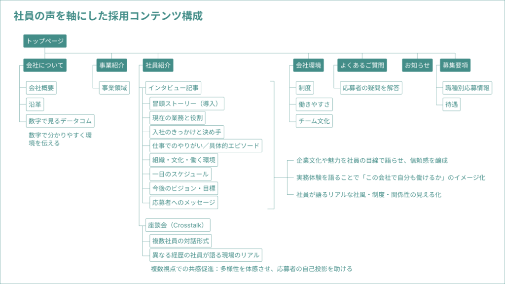 社員紹介や座談会などを中心に、「この会社で働く意味」を伝える導線を構築しました。