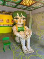 学校全体が芸術作品になっているところにも鑑賞しました。建物全体がアートになっており、校舎の一部だけでなく、壁や床の細部に至る繊細な作品でした。まるで絵本の中に迷い込んだ不思議でワクワクする空間でした。
