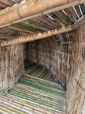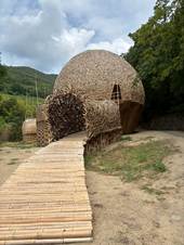 世界的に有名な台湾のアーティストである、ワン・ウェンチー(王文志)さんの『抱擁・小豆島』。美しいドームの内部に入ると、竹できた素晴らしい空間が待っています。その空間は、島や地球で生きていることを実感させてくれました。そこは涼しく、ゆったりとした時間が流れていました。そこで私は、幼い子供たちが頑張って歩いているところを眺めていました。メンバーのところまで子供の一人が歩いたり、周りの人に手を振っている様子など、ほほえましいのんびりとしたひと時でした。芸術が人と自然、人と人との間にゆるやかなつながりをつくってくれることを、肌で感じることができた瞬間だった。