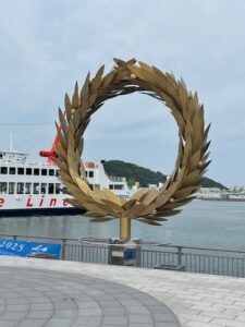 オリーブで名高い島の玄関口に立つこの作品は、オリーブの葉を王冠の形に仕立てた巨大な輪。金色に光る円環の向こうに広がる海を眺めると、まるで島全体が光に包まれているように感じられた。瀬戸内に来た喜びと、これからのアート巡りへの期待を高めてくれる最初の一歩である。タイトルを知る前は、単に「歓迎のシンボル」のように見えたが、「太陽の贈り物」と知った後には、島の光や自然そのものが訪れる者への祝福として差し出されているように感じられ、作品の輝きにいっそう温かみを覚えた。