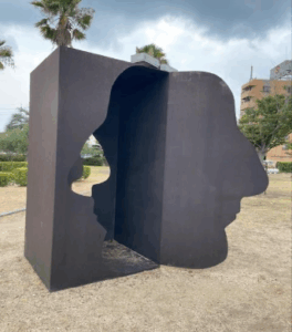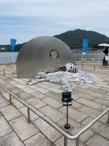 そして印象的だったのが、《いっしょに/ともだち》(スタシス・エイドリゲヴィチウス)。約2メートルの大きなオブジェが向き合い、助け合う姿や横顔のドアを表現している。「人と人が共にあること」や「つながりの大切さ」を、シンプルでありながら深い形で伝えてくれる。小豆島という島の共同体の歴史や、人と人とが支え合って生きることの普遍性を感じずにはいられなかった。タイトルを知らなかったときは、形の面白さや配置の調和に目が向いたが、「いっしょに/ともだち」と知った後は、向き合う姿がまるで語り合う人々のように見え、温かな人間関係の象徴として心に残った。