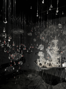 漁師でもある作家が「大気で空想を釣り上げる」というコンセプトで制作したという。天井からは釣り針が垂れ下がり、まるで見えない魚を狙うかのように空間を漂っている。ガラスでできた雲は厚さわずか0.2mmという極限まで薄い造形で、その繊細さには驚かされた。壊れそうであるのに、光を受けると柔らかさと力強さを同時に放っているのが不思議である。