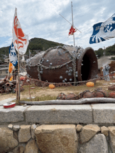 巨大なタコ壺にフジツボが付着し、足元にはタコの吸盤を模したオブジェ、そして頭上では色とりどりの旗が風に揺れている。力強くも遊び心のあるこの作品は、まさに男木島のシンボルである。古くから“タコの島”と呼ばれ、潮流に揉まれて育った身の太いタコは島の誇りでもある。長年続けられてきたタコ壺漁への愛着が、このアートに込められているんだと思うと単なるオブジェではなく暮らしの延長にある作品として胸に響いた。島の物語とともに生まれたからこそ、風景に自然と馴染んでいる。