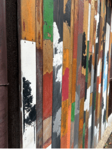 島で集めた廃材や廃船を再利用し、そこに海や空、木々を感じさせる色やシルエットを描いた作品が外壁に設置されている。鮮やかな色合いが古い建物の壁に寄り添うように存在していて、アートでありながら島の風景の一部に見えるのが不思議であった。近づいてよく見ると、小さな人の姿が描かれていたりと細部にも物語が隠されていて、見れば見るほど発見があるのも楽しいポイントである。この壁画は4箇所点在しており、散策しながら「次はどこにあるのだろう」と探す楽しみもある。ただ展示されているのではなく、島そのものを歩くことで完成する作品になっているように感じる。