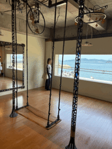 ブランコに腰を下ろしゆっくりと漕ぎ始めると、頭上の天井に取り付けられた車輪が歯車のように回転し、シンバルやベルの澄んだ音色が部屋中に響き渡る。その仕組みは単純でありながらも、音の広がり方や響きが妙に心に染み入ってくる。窓の外には瀬戸内海の青い景色が広がり、ブランコの揺れと重なって景色までもが流れていくように感じる。日常の時間の流れから切り離され、心が静かに解き放たれる瞬間だった。作品に「ヨガ教室」という名が付けられていることにも納得がいく。